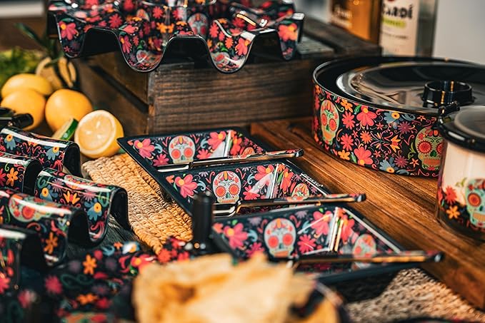 The Prepara 3 Section Taco Tray is perfect for organizing and serving your favorite taco toppings. This practical tray features three separate sections to keep ingredients like lettuce, cheese, and tomatoes neatly divided and easily accessible. The durable, easy-to-clean design ensures it will last through many taco nights. The exclusive Day of the Dead edition design adds a fun, festive touch to your table, making it a must-have for any taco enthusiast.